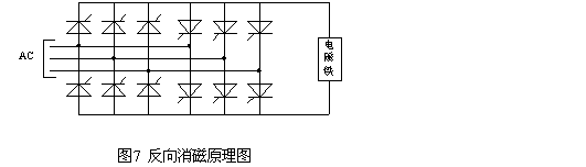 一般的退磁方法是在電磁鐵電流為零時(shí)輸入反向電流。電磁鐵在斷電瞬間,內(nèi)部繞組相當(dāng)于一個(gè)大電感,傳統(tǒng)的直流接觸器開關(guān)動作慢,因而產(chǎn)生相當(dāng)大的自感電勢,其值可達(dá)上千伏,因無退磁回路,所以在觸點(diǎn)處便形成電弧放電,燒壞設(shè)備。 Mentor || 直流驅(qū)動器是一個(gè)可控硅全控橋電流控制器。通過控制可控硅的觸發(fā)角,不僅可以控制電流的大小,也可以控制電流的方向。在電磁鐵斷電瞬間,通過控制可控硅的觸發(fā)角,在電磁鐵兩端加反向電流。這個(gè)過程非常短,能夠到達(dá)毫秒級。因而能夠?qū)㈦姶盆F儲存的能量一部分克服矯頑磁力,一部分反饋到電網(wǎng)而不產(chǎn)生破壞作用。在剩磁消失后,反向電流也減為零。一般的反向電流的大小可以通過磁滯回線計(jì)算得出。在電磁鐵吸力小于吊重時(shí),就可以斷電。其原理如下: